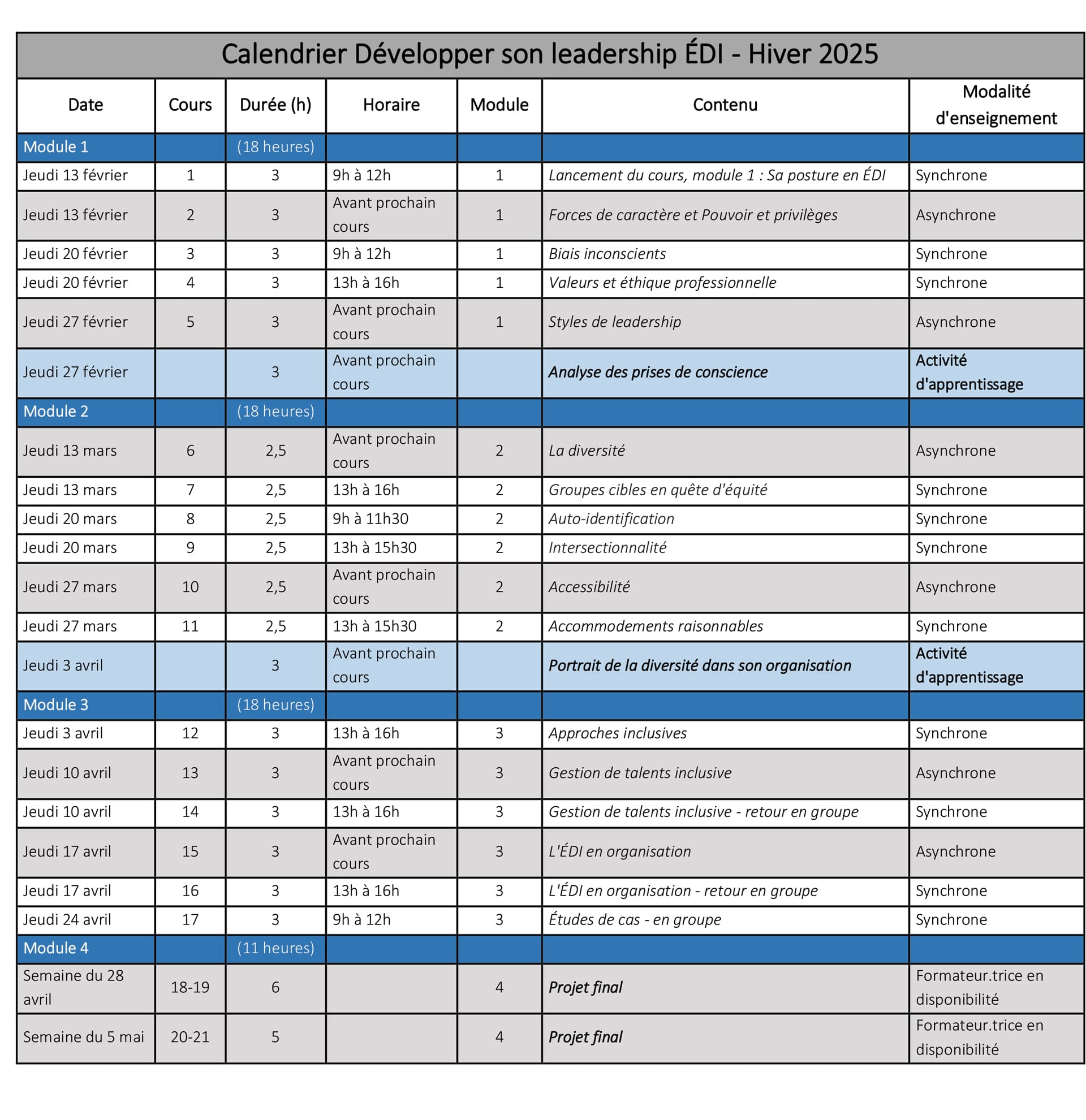 Horaire et dates : Les cours auront lieu les jeudis de 9h00 à 12h00 et de 13h00 à 16h00, début le 13 février 2025. (Aucun cours n’est prévu la semaine du 4 mars)